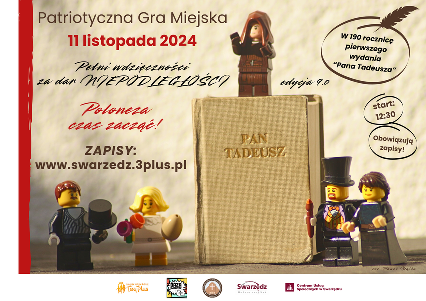 Gra terenowa rozpocznie się na placu przy kościele Chrystusa Jedynego Zbawiciela w Swarzędzu (os. Mielżyńskiego 1a), a po wspólnym starcie drużyny wyruszą, by wykonać zadania w rozmieszczonych w okolicy punktach. Rozpoczniemy wspólnym odtańczeniem poloneza o godzinie 12:30 (część drużyn będzie proszona o rejestrację przed, a część po tej godzinie - informacje zostaną przesłane mailowo zgłoszonym osobom), zakończenie gry do godziny 16:00.