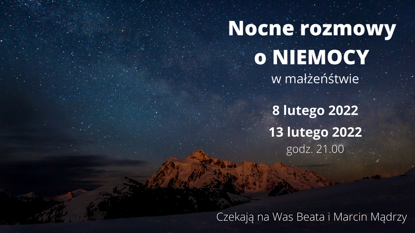 Zapraszamy na internetowe rozmowy z Państwem Beatą i Marcinem Mądrymi - 8.02 (wtorek) "Kiedy przychodzi nieMOC" i 13.02 (niedziela) "Razem przez nieMOC". Można wziąć udział w obu spotkaniach lub wybrać jedno z nich. Zapisy przez formularz na dole strony. Zobaczcie co przygotowali dla nasi prelegenci.