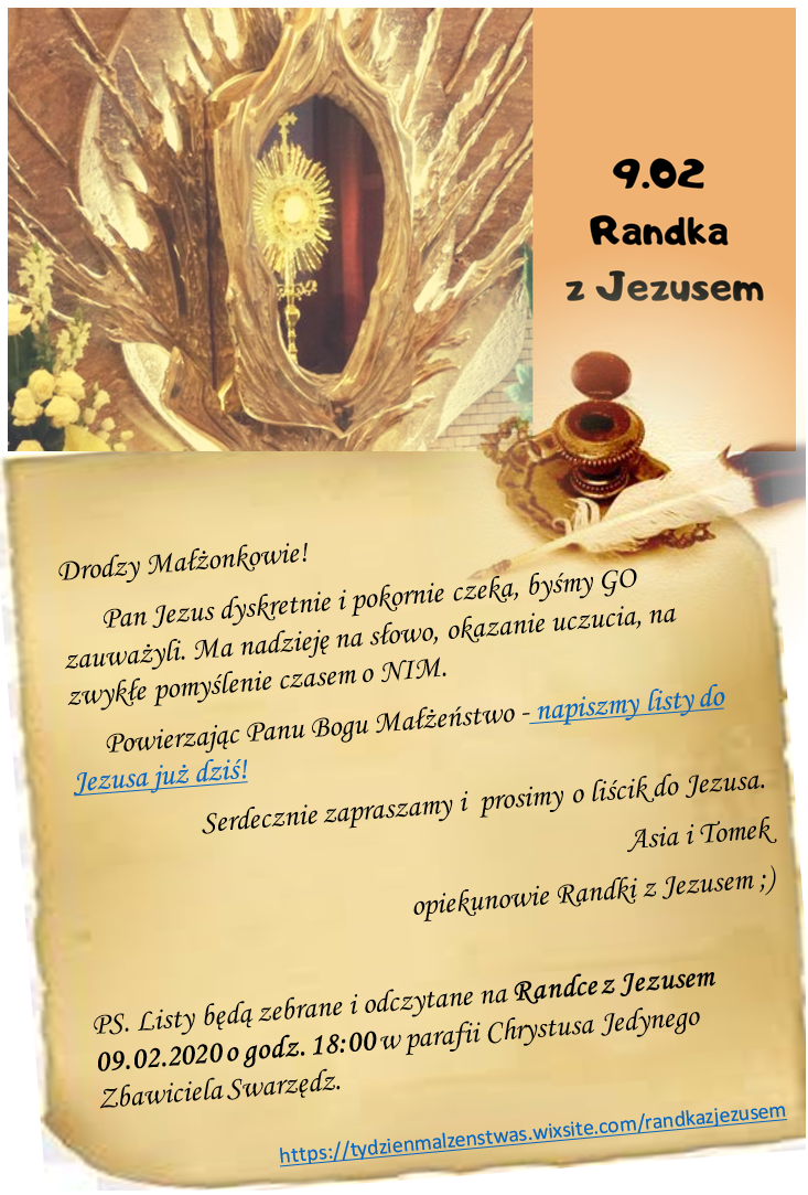 Już dziś możemy zebrać nasze intencje wysyłając list do Pana Jezusa przez stronkę: https://tydzienmalzenstwas.wixsite.com/randkazjezusem